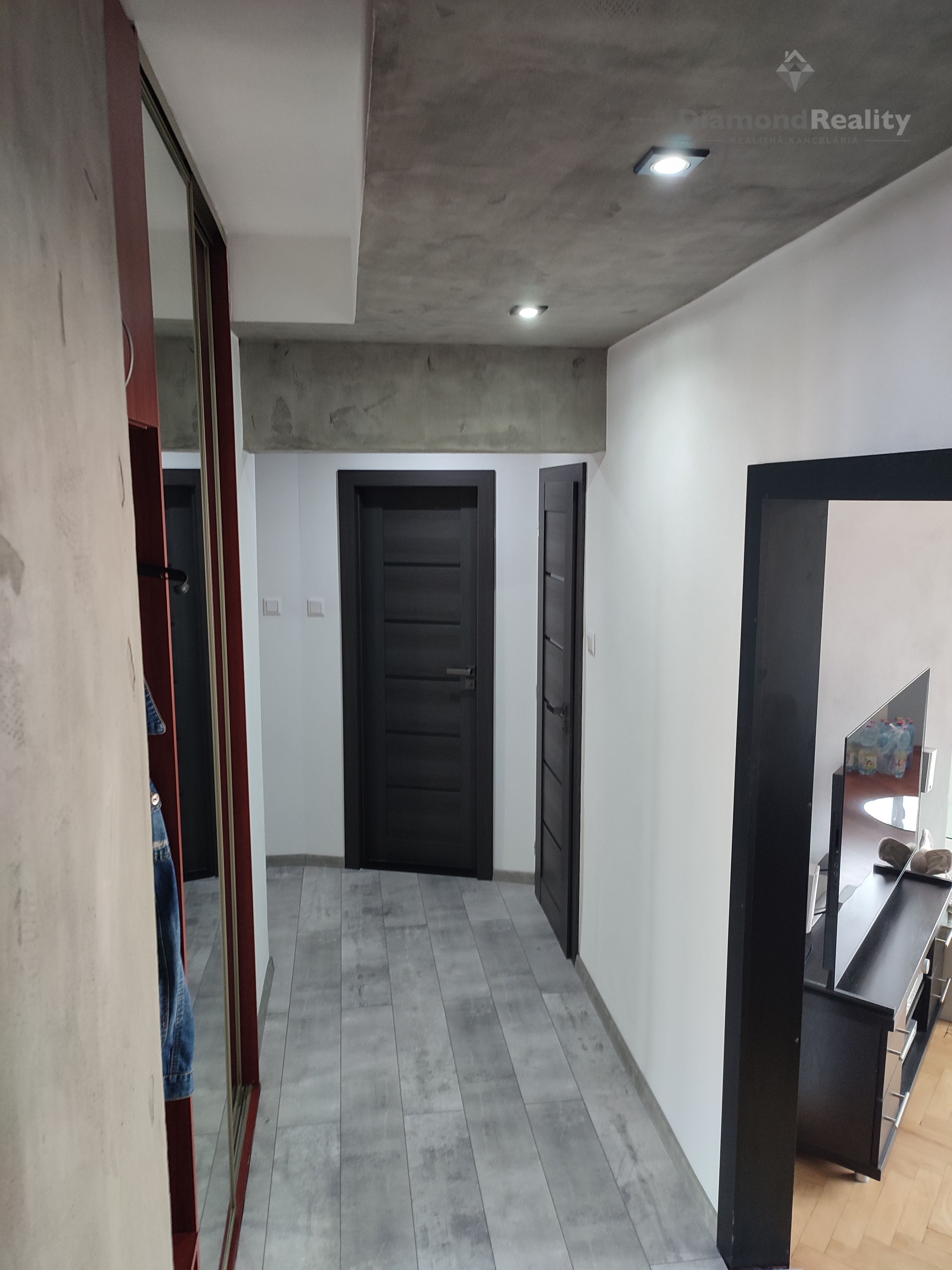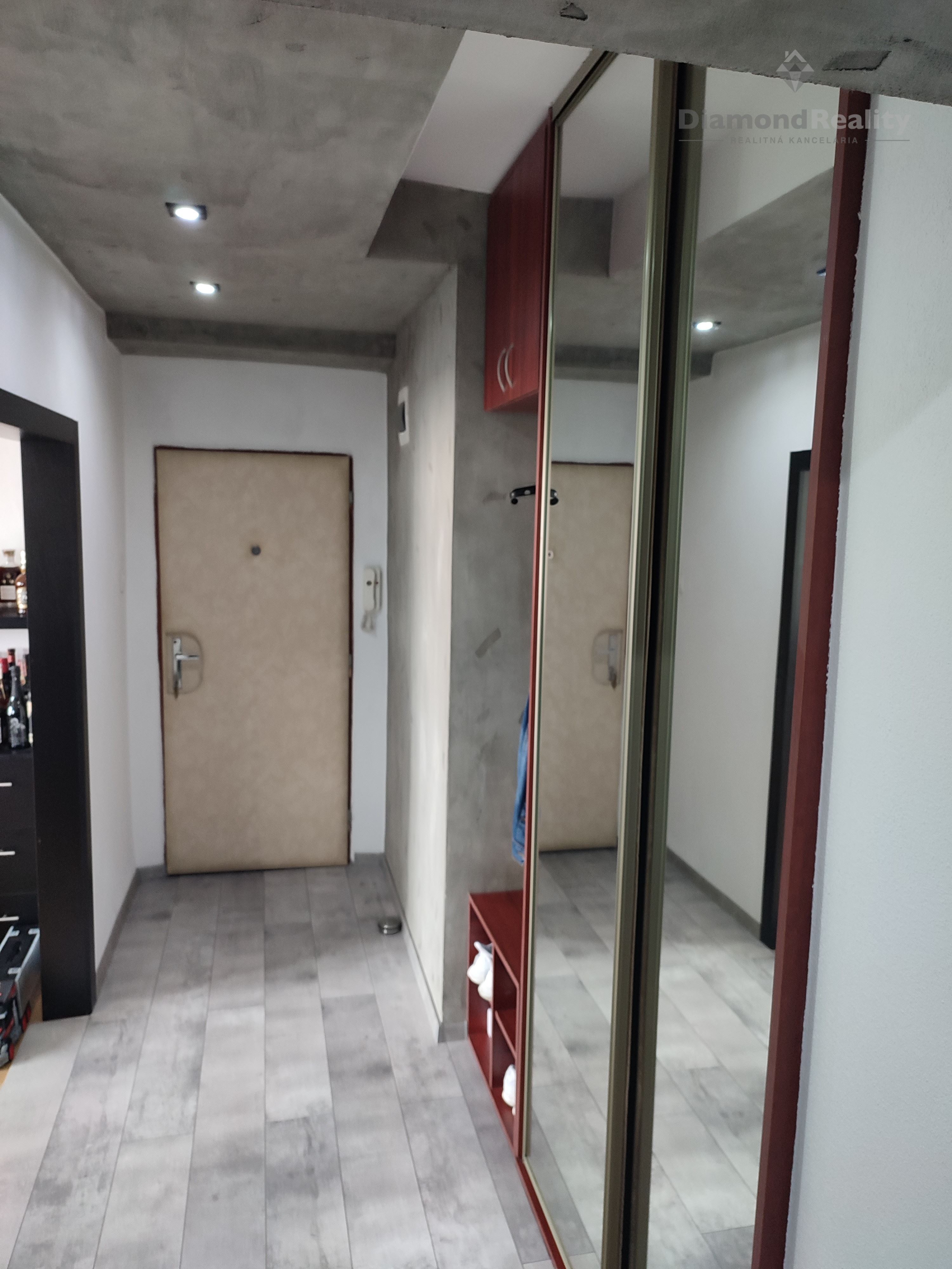 Dispozícia: Spálňa je orientovaná na juh so vstupom na balkón. Od vstupu po pravej strane sa nachádza obývačka prepojená s kuchyňou, orientovaná na sever. K bytu prislúcha aj komora na chodbe a pivnica. Na konci chodby je samostatné WC a zrekonštruovaná kúpeľňa so sprchovým kútom a vaňou.