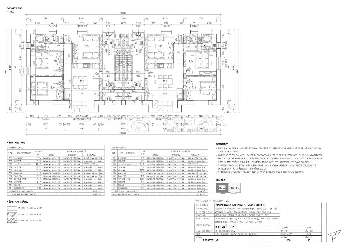 Prízemie: - vstupná chodba, spoločenská miestnosť, kuchynka, 3 izby, kúpeľňa, WC