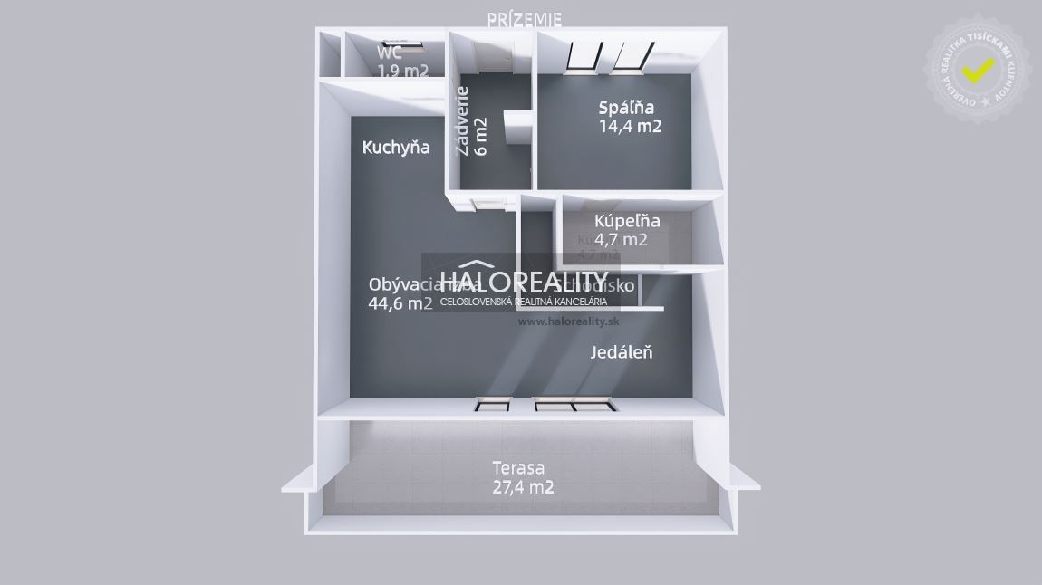 PRÍZEMIE má úžitkovú plochu cca 72 m², pozostáva zo zádveria, otvorenej dispozície priestrannej obývacej izby s kuchyňou, spáľne, kúpeľne, samostatného WC, schodiska a priestrannej terasy.