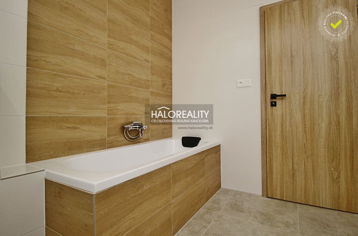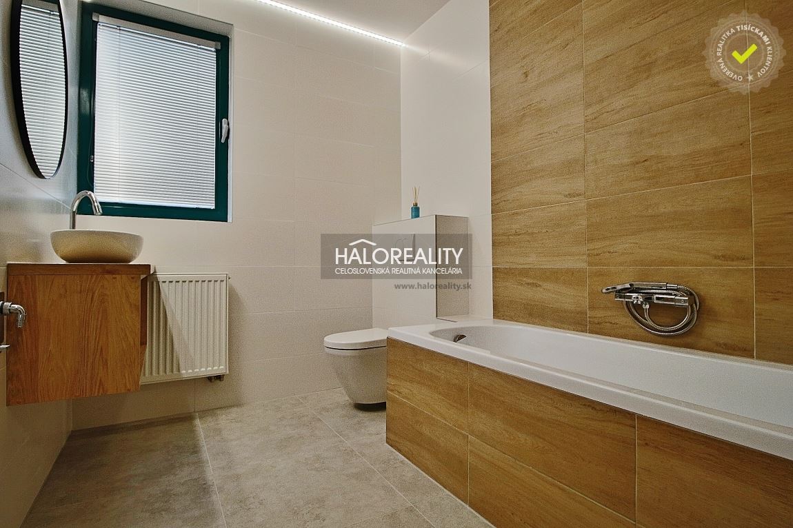 Kúpeľňa má vaňu, závesnú toaletu, umývadlo a okno.