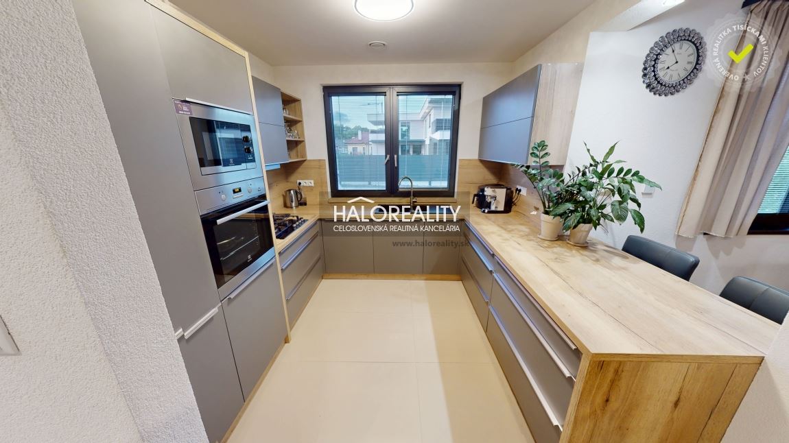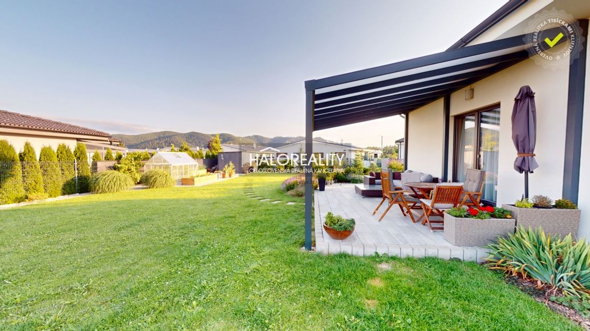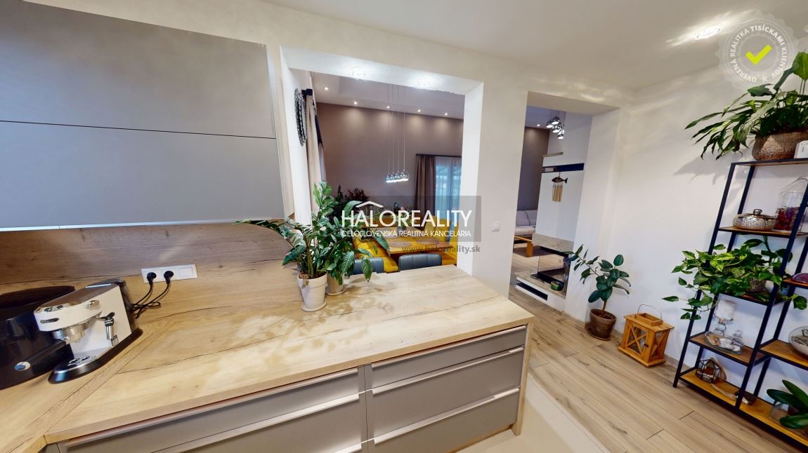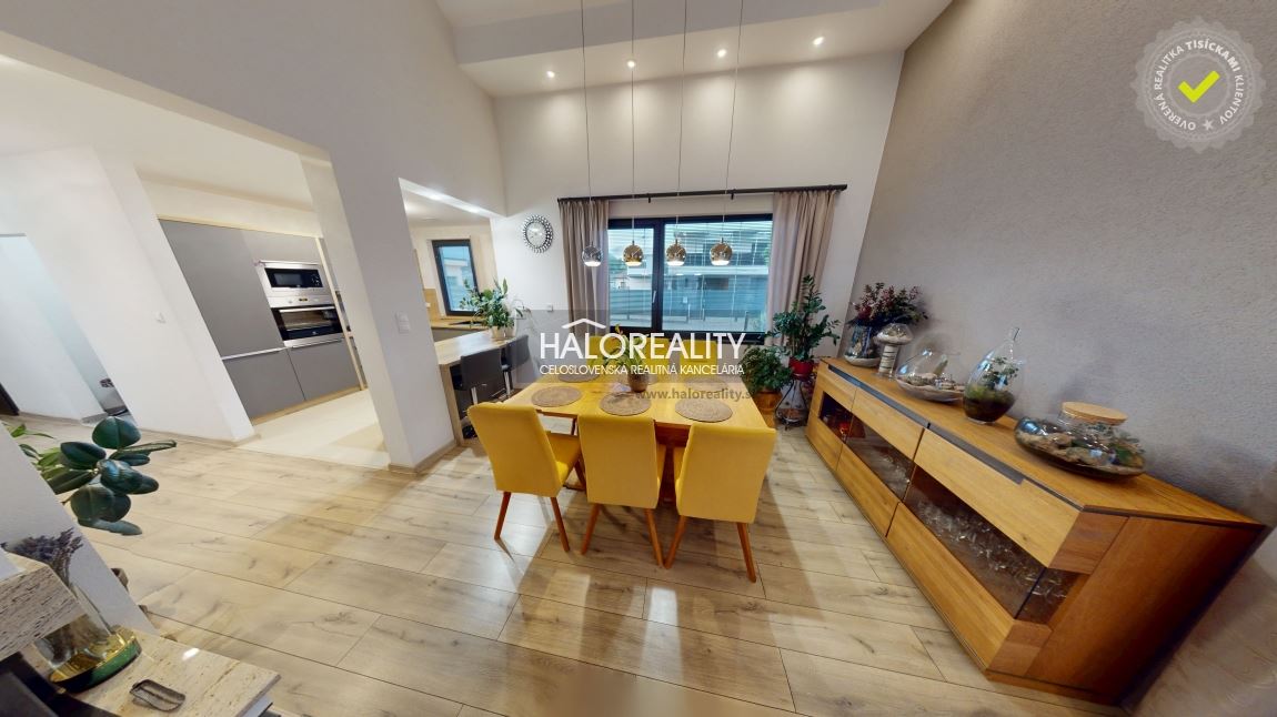 Naľavo od vstupu sa dostávame do veľkej obývacej miestnosti, ktorá je prepojená s modernou kuchyňou a jedálenskou časťou. Tento priestor je srdcom celého domu – vďaka veľkým francúzskym oknám je krásne presvetlený počas celého dňa a vytvára príjemnú atmosféru na každodenné bývanie aj spoločné chvíle s rodinou. Dominantou tejto časti je krb, ktorý dotvára útulnosť priestoru a zároveň slúži ako doplnkový zdroj tepla. Z obývacej izby vedie priamy vstup na zastrešenú terasu o výmere 34 m², ktorá je orientovaná do záhrady a ponúka ideálny priestor na oddych či rodinné posedenia.