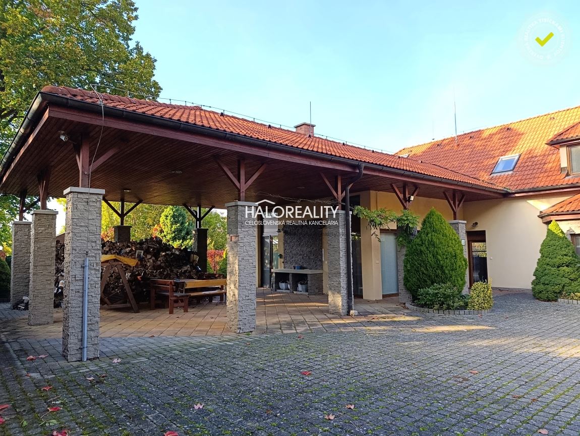 Z kuchyne je východ na zastrešenú terasu, v blízkosti záhradný krb na grilovanie a opekanie. Veľká zastrešená terasa slúži pre uskladnenie dreva do krbu, miesto na parkovanie, môže slúžiť aj na veľké rodinné stretnutia alebo iné príležitosti.