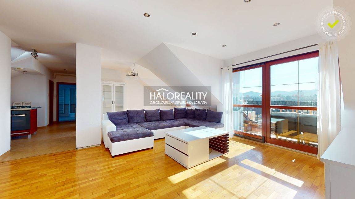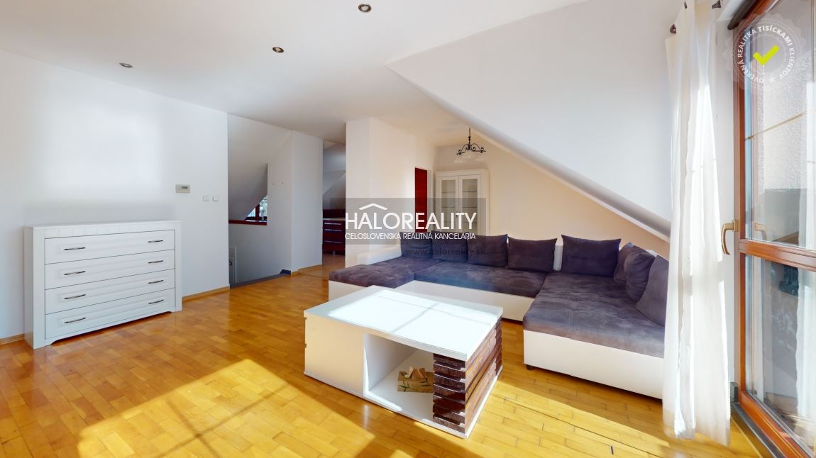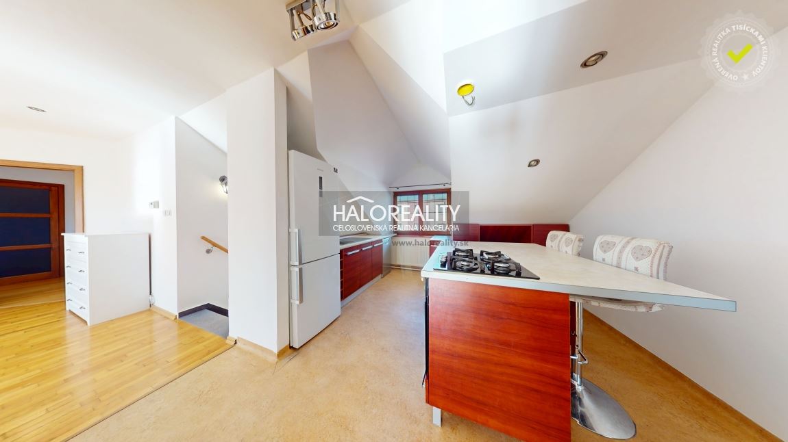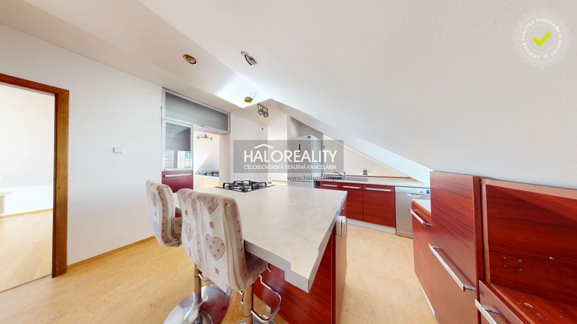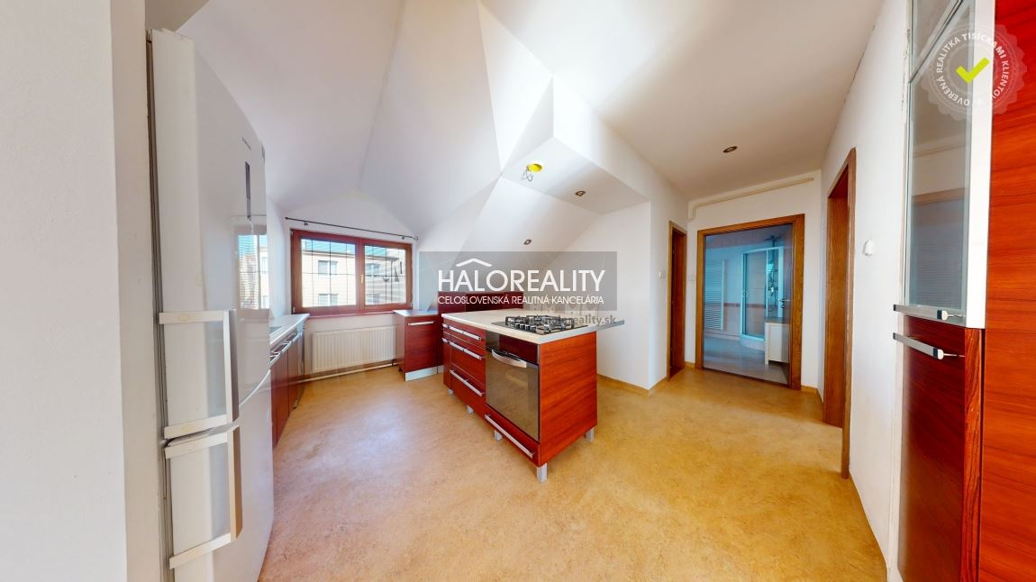 Na predaj priestranný podkrovný 4-izbový byt s loggiou v OV blízko centra mesta Spišská Nová Ves, ul. Banícka. Byt, s podlahovou plochou s príslušenstvom 107,02 m² bez plochy loggie, sa nachádza v zrekonštruovanom tehlovom obytnom dome bez výťahu na 4/4 p. s orientáciou na S, J a Z. K bytu prislúcha aj jedna pivnica v suteréne obytného domu, spoluvlastnícky podiel na spoločných častiach a spoločných zariadeniach domu, na príslušenstve v podiele 759/10000 a spoluvlastnícky podiel k pozemku v podiele 759/20000. DISPOZÍCIA:Byt pozostáva zo vstupnej chodby so schodmi, ktoré vedú do haly/obývacej izby komunikačne prepojenej s kuchyňou a jedálenskou časťou, z dvoch priechodných izieb so šatníkom, samostatnej izby (spálne) so vstavanými skriňami, veľkorysej kúpeľne s rohovou vaňou a sprchovacím kútom a samostatného WC.