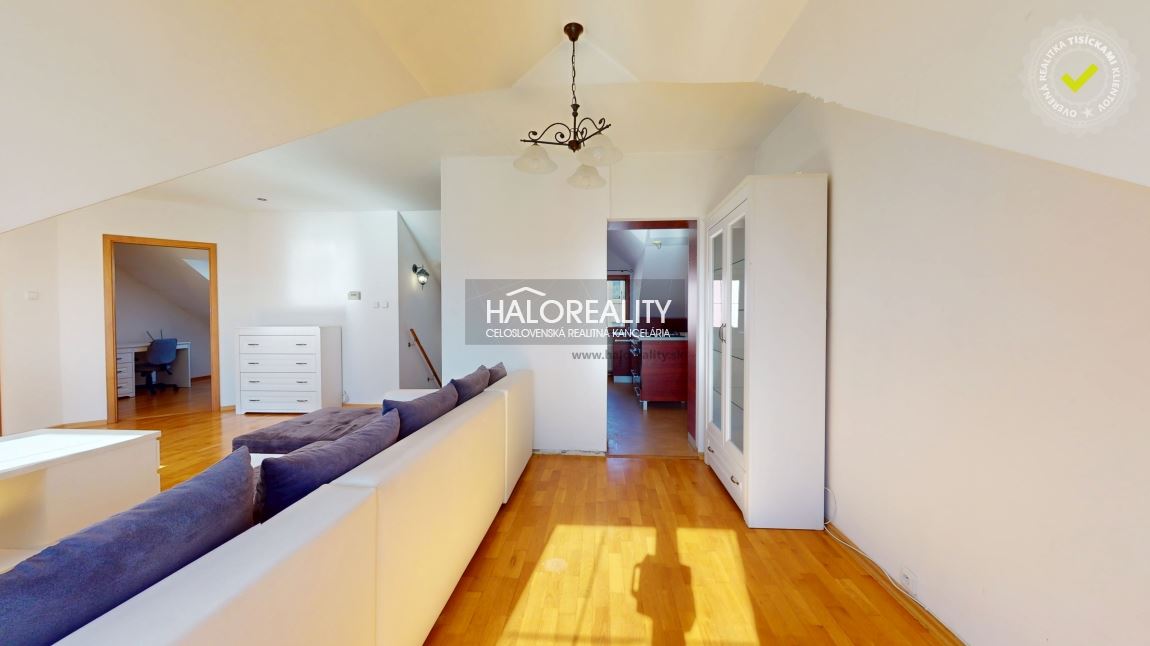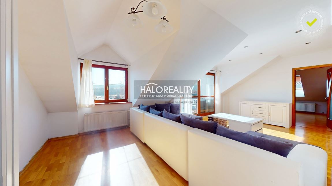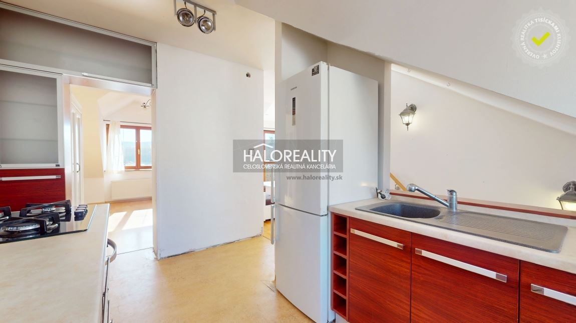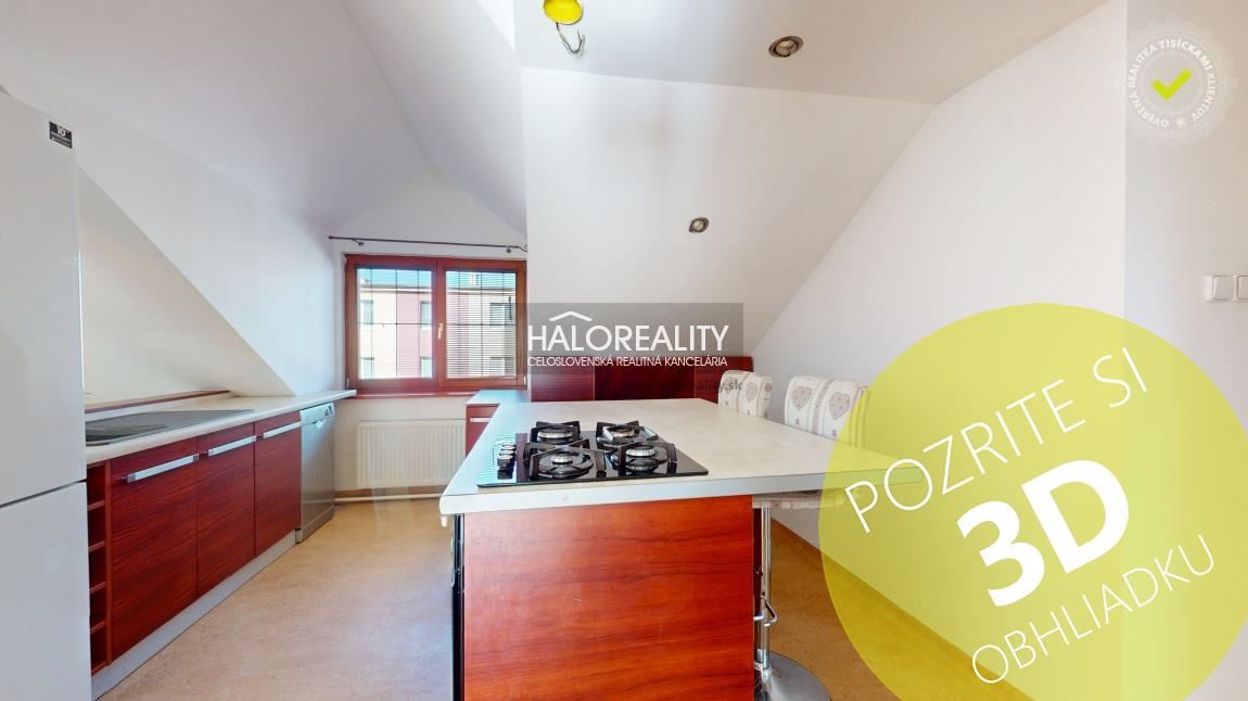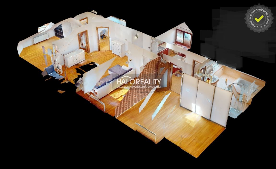 Na predaj priestranný podkrovný 4-izbový byt s loggiou v OV blízko centra mesta Spišská Nová Ves, ul. Banícka. Byt, s podlahovou plochou s príslušenstvom 107,02 m² bez plochy loggie, sa nachádza v zrekonštruovanom tehlovom obytnom dome bez výťahu na 4/4 p. s orientáciou na S, J a Z. K bytu prislúcha aj jedna pivnica v suteréne obytného domu, spoluvlastnícky podiel na spoločných častiach a spoločných zariadeniach domu, na príslušenstve v podiele 759/10000 a spoluvlastnícky podiel k pozemku v podiele 759/20000. DISPOZÍCIA:Byt pozostáva zo vstupnej chodby so schodmi, ktoré vedú do haly/obývacej izby komunikačne prepojenej s kuchyňou a jedálenskou časťou, z dvoch priechodných izieb so šatníkom, samostatnej izby (spálne) so vstavanými skriňami, veľkorysej kúpeľne s rohovou vaňou a sprchovacím kútom a samostatného WC.