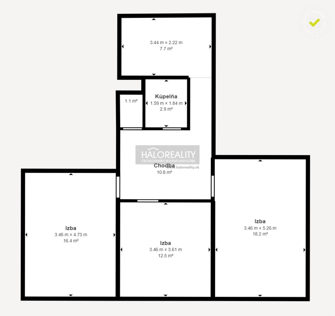 Vľavo za vstupnými dverami je vstup do WC, ďalej vľavo je kúpeľňa, za bytovým jadrom je chodba do kuchyne. Všetky tri obytné miestnosti sú samostatne prístupné priamo z chodby, všetky tri nepriechodné a orientované na východ.