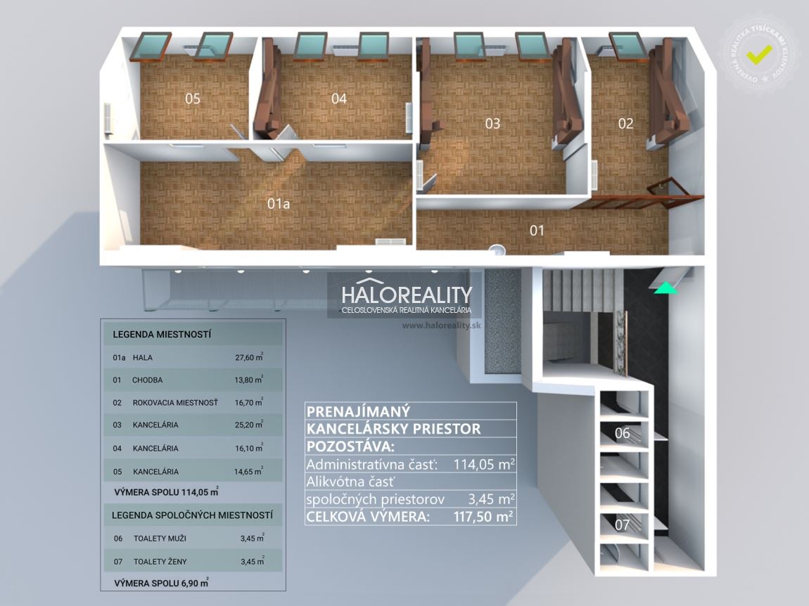 Ponúkame na prenájom reprezentatívny kancelársky priestor situovaný na 4/4 nadzemných podlaží (4/4 NP) v historickej administratívnej budove s výmerou 117,50 m² v Bratislave m.č. Staré Mesto. Kancelársky priestor sa skladá zo 4 samostatných kancelárií, z haly, chodby, rokovacej miestnosti, zdieľané toalety. MOŽNOSŤ ROZŠÍRENIA PRIESTORU O 2 KANCELÁRIE AŽ NA VÝMERU 175,45 m² ! VOĽNÉ OD 1.3.2025.