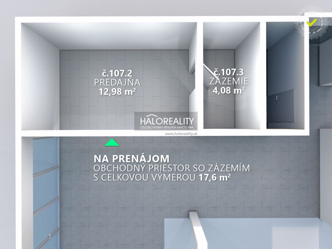 Ku všetkým priestorom platí, že vlastník je schopný na základe dohody s nájomcom, sa podieľať na čiastkových nákladoch, kde to bude naozaj nutné (napr. dlažba / prípojka vody a pod.).DISPOZÍCIA:Obchodný priestor s celkovou výmerou 17,6 m² pozostáva z 2 miestností - z predajne 12,98 m² a zázemia 4,08 m². Súčasťou vybavenia je aj uzamykateľná rolovacia mreža MIKROFORATA (Jej plášť tvoria lamely z pozinkovanej ocele s mikroperforovanými otvormi). Najväčšou výhodou prevedenia mikroforata je schopnosť udržať uzavretý priestor priebežne vetraný a zabrániť vniknutiu hmyzu a hlodavcov.VÝHODY:Prevádzka v takomto obchodnom dome prináša viacero výhod: