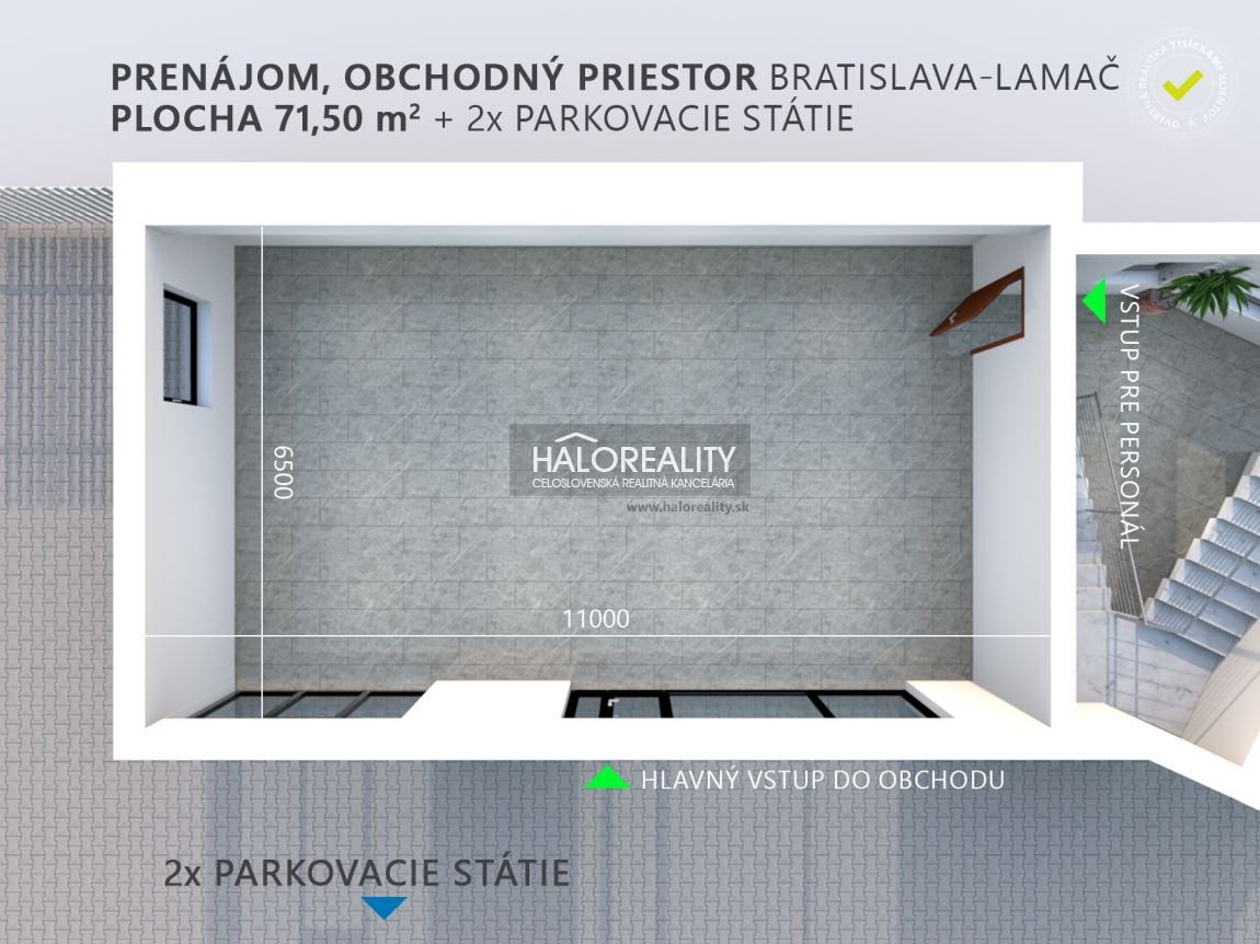 Ponúkame na prenájom exkluzívny obchodný priestor s veľkým výkladom v administratívnom objekte v Bratislave IV v katastrálnom území Lamač. V cene sú aj 2 parkovacie státia situované pred objektom. Obchodný priestor o ploche 71,50 m² je vybavený so zabudovanou klimatizáciou v strope, kuchynkou v blízkosti priestoru vrátane zdieľaného WC a s dvoma parkovacími státiami v cene. Priestor sa nachádza na prízemí, je tu možnosť umiestniť na fasáde pred vstupom aj reklamu resp. označenie prevádzky. VOĽNÉ IHNEĎ!DISPOZÍCIA:Pozostáva z obchodného priestor o celkovej ploche 71,50 m², (rozmer miestnosti 6,5 x 11 m), k priestoru prislúcha aj kuchynka v blízkosti priestoru vrátane zdieľaného WC a 2 parkovacích státí na parkovisku v areály. Pozrite si 3D pôdorys vo foto galérii ponuky.MESAČNÉ NÁKLADY:Nebytový priestor: 71,50 m²; 929,50 €/mesiac (bez DPH)
