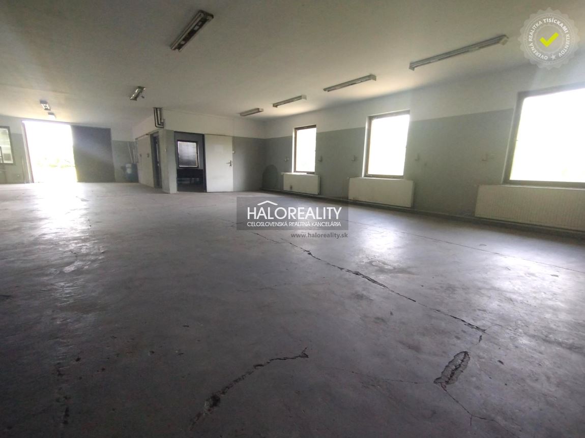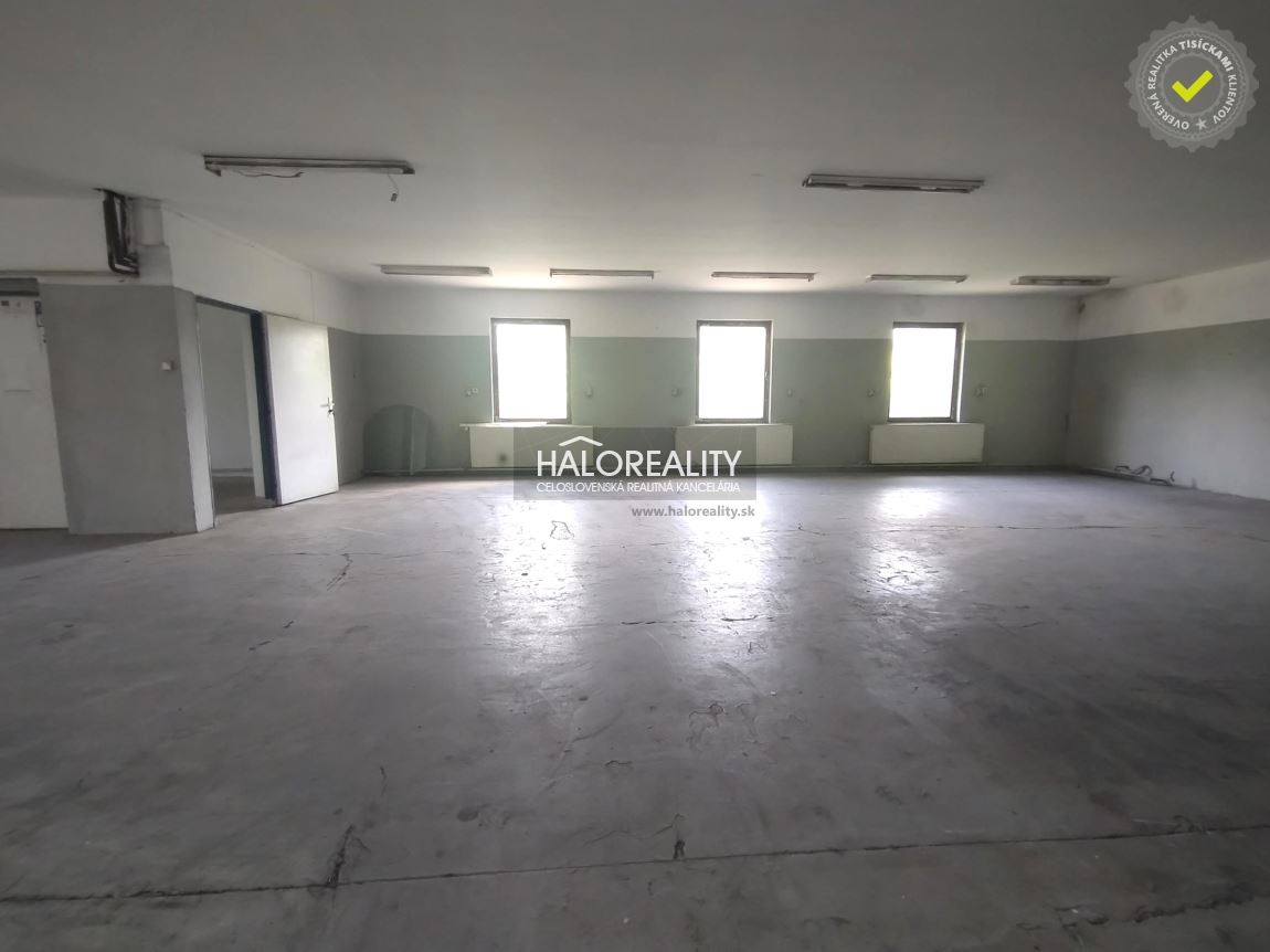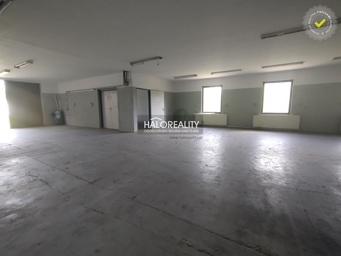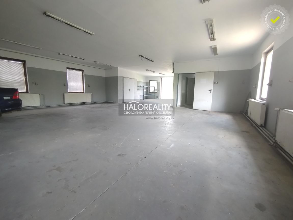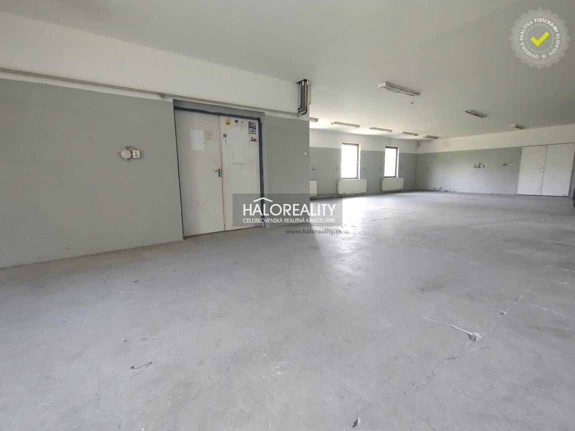 Dispozícia – 1 veľká hala, 1 kancelária. Na poschodí k dispozícii toaleta. Pred budovou je tiež garáž, ktorá je súčasťou prenájmu.
